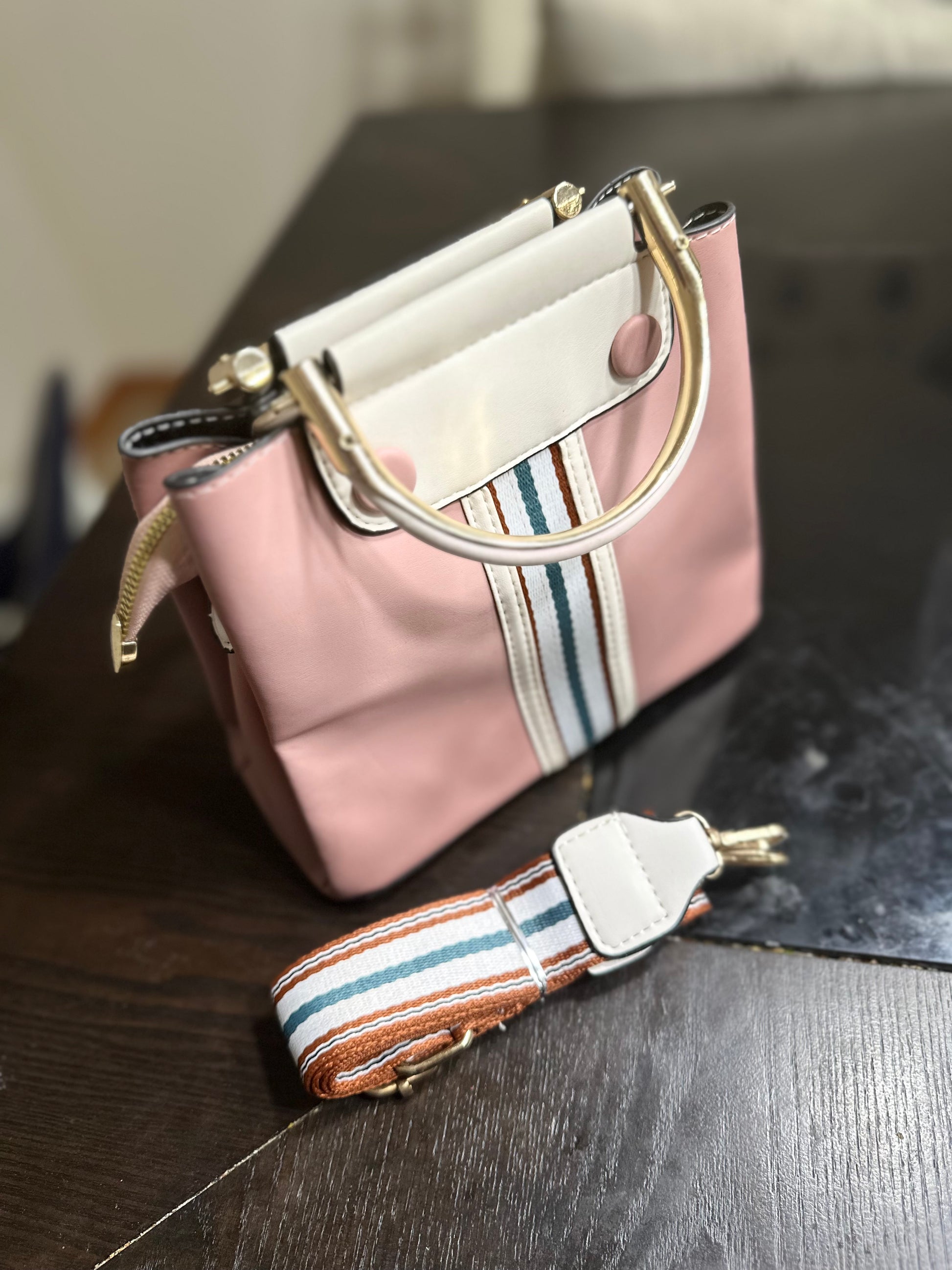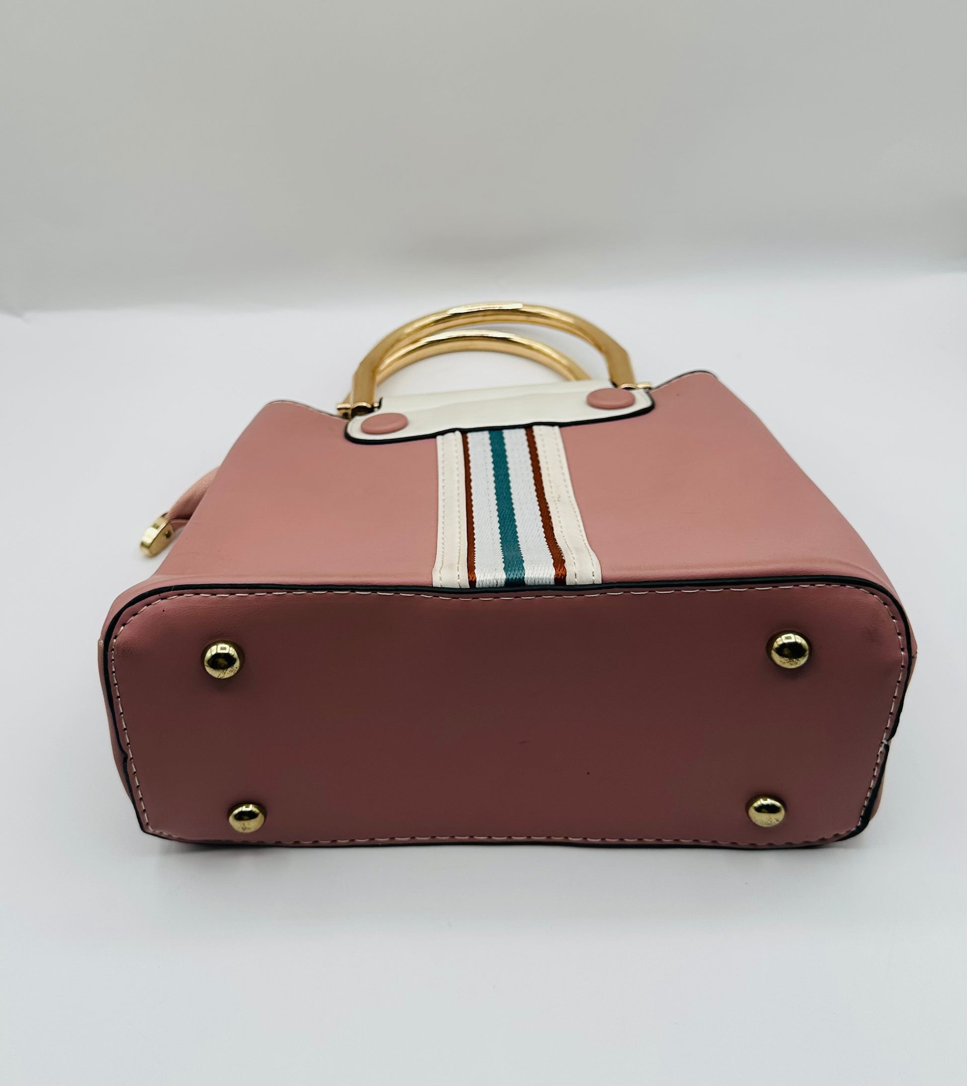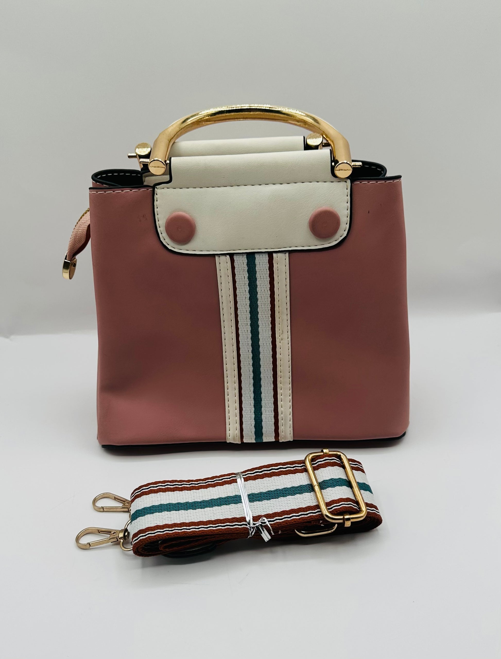 The Pinkette is a versatile and stylish accessory with a metal handle and attachable strap that can easily hold all your belongings. Perfect for any occasion, it is designed to suit all your needs. Make a statement with the Pinkette.